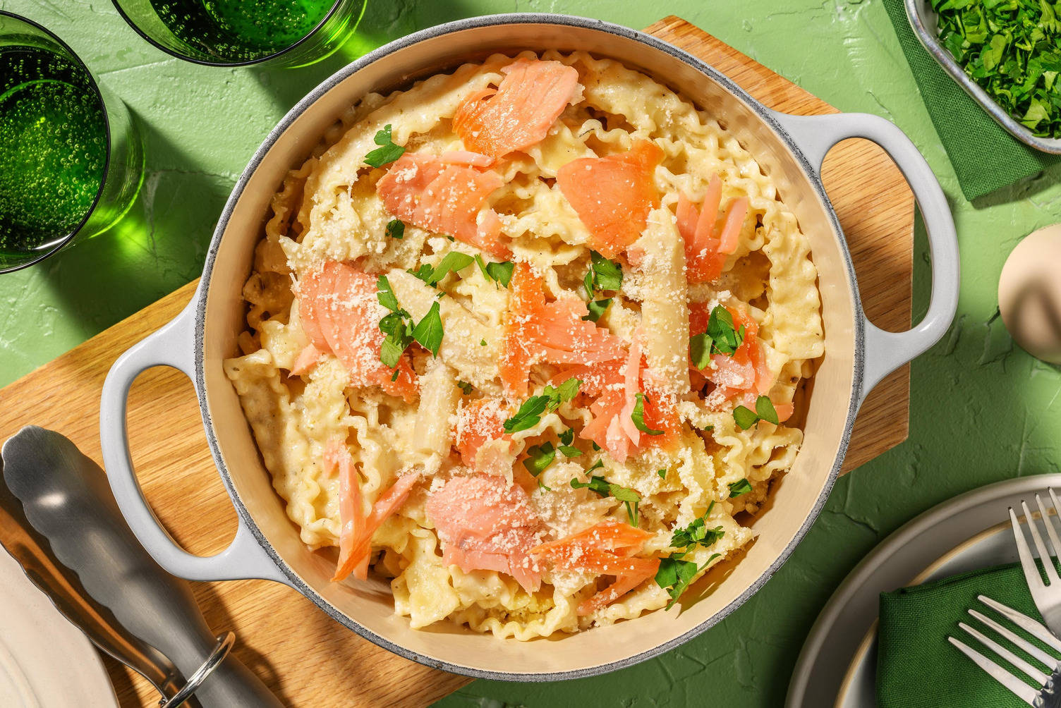 Pour les asperges, portez à ébullition 1 litre d’eau par personne dans la grande casserole. Dans l’autre casserole, portez à ébullition 400 ml d’eau par personne pour les pommes de terre.