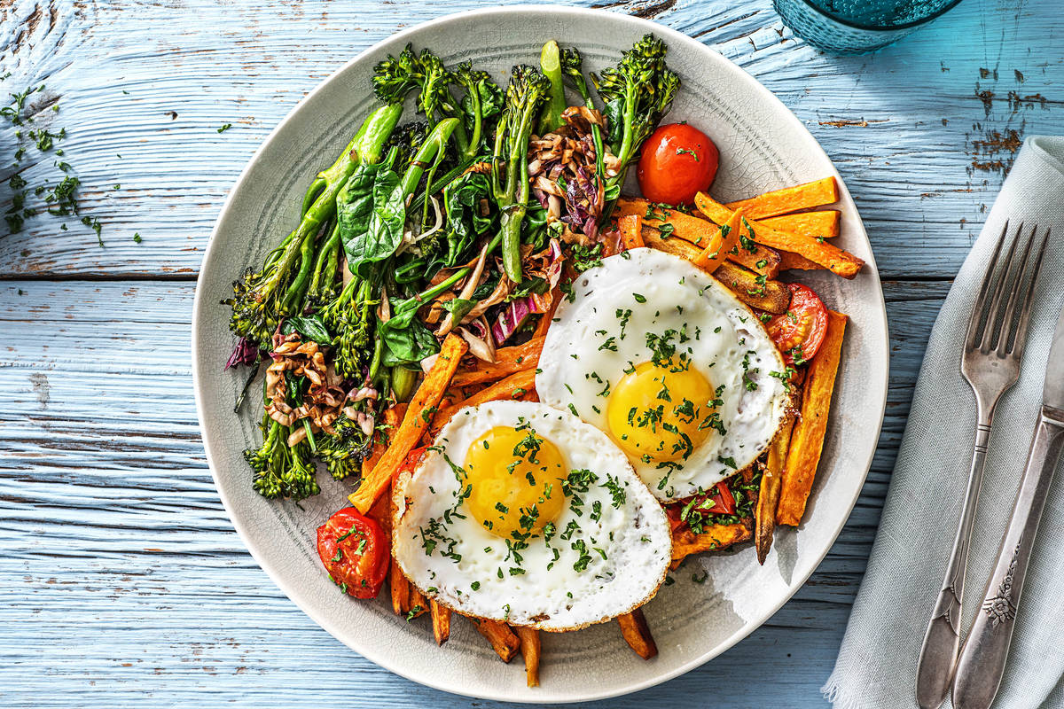 Schep de bataat met tomaat op de borden leg de spiegeleieren er voorzichtig op. Garneer het ei met de krulpeterselie en schep de salade met bimi ernaast.