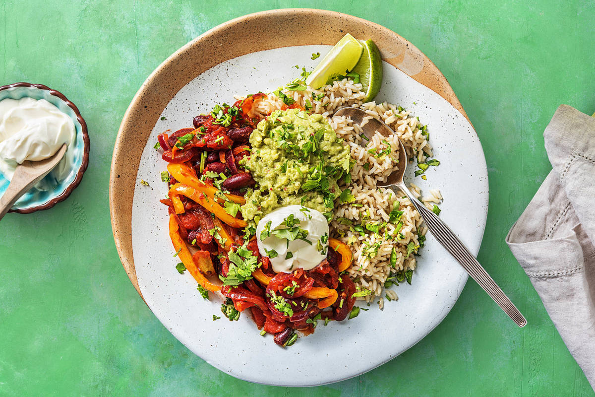Servez le riz sur les assiettes et le chili sin carne dessus.Servez le guacamole et de la crème aigre en accompagnement.Garnissez du reste de coriandre et des quartiers de citron vert.