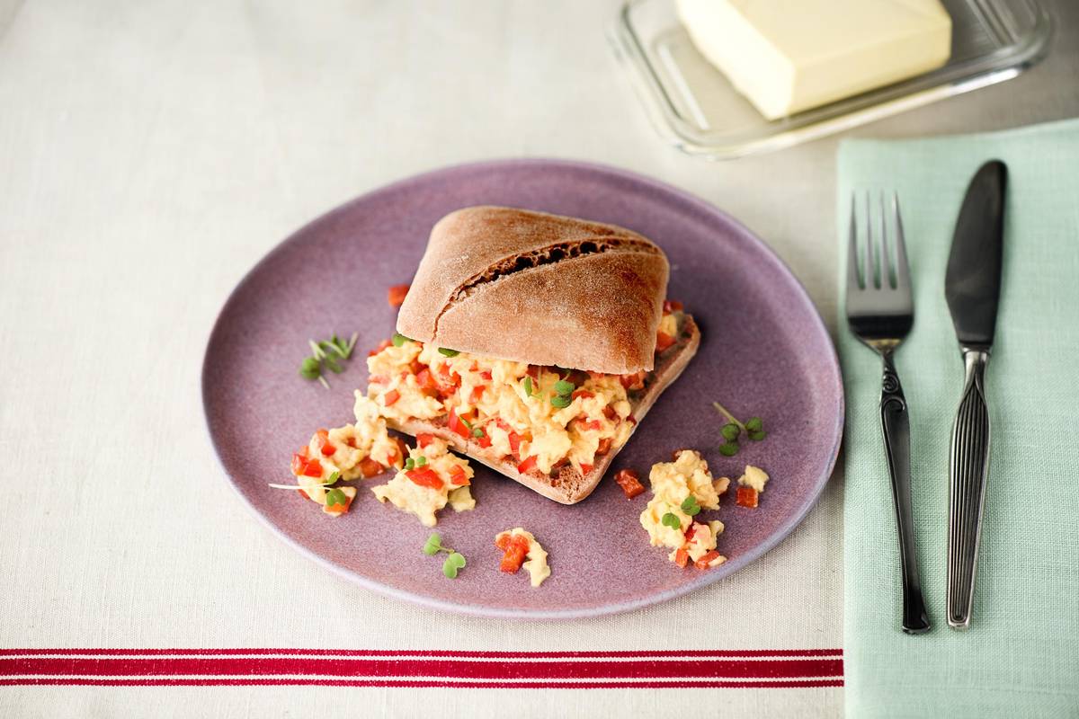 Coupez les ciabatta en deux et servez-les sur les assiettes, puis garnissez-les avec les œufs brouillés. Ciselez le cresson, placez-le sur les œufs brouillés et refermez le pain.