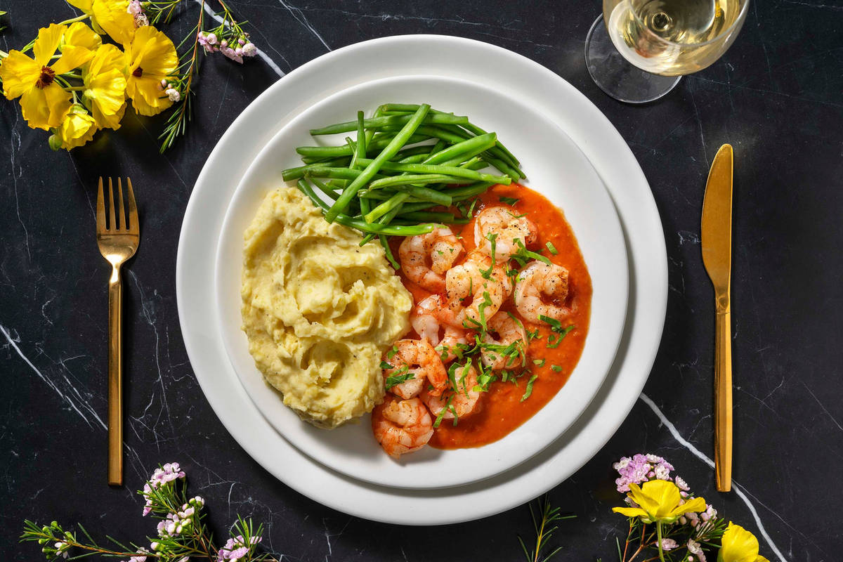 Servez la sauce tomate dans des assiettes creuses et déposez-y la purée de pommes de terre. Disposez les crevettes par-dessus et parsemez de persil. Accompagnez des haricots verts.