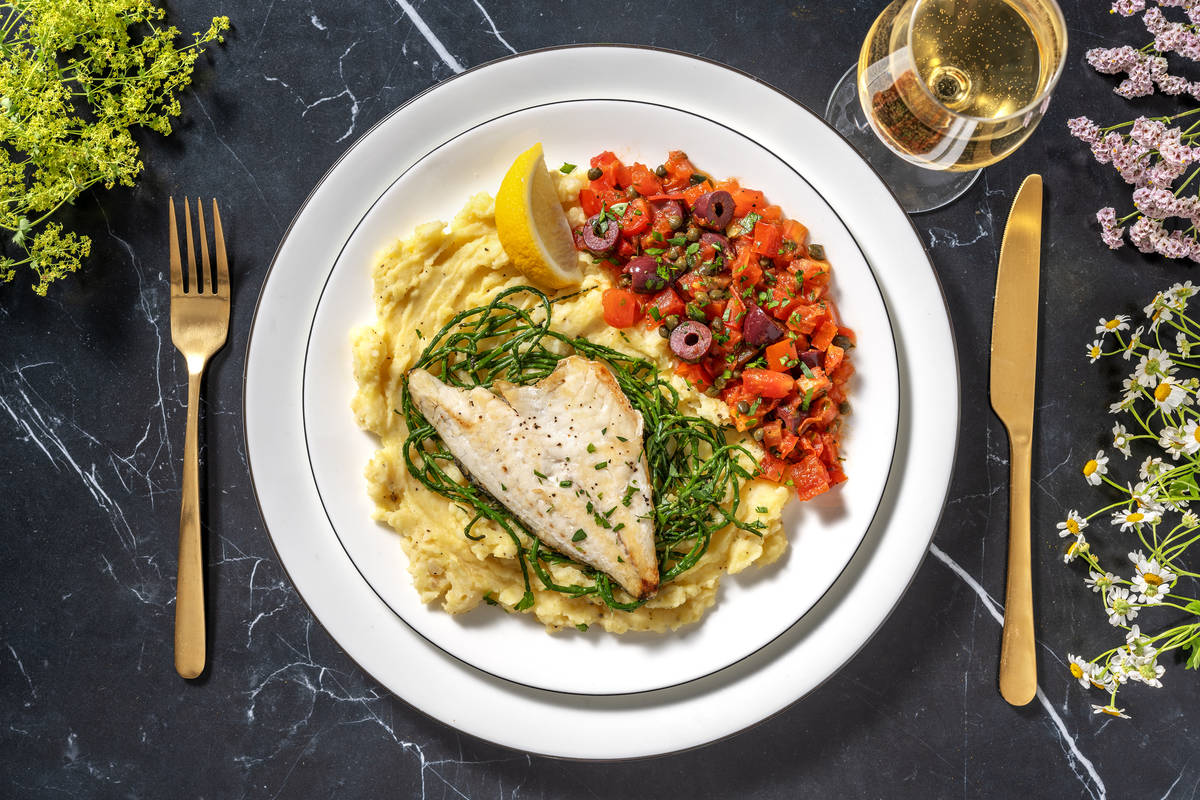 Servez la purée de céleri-rave sur les assiettes. Disposez les salicornes poêlées par-dessus. Disposez le poisson sur les salicornes. Accompagnez de la sauce tomate aux olives et du reste de persil. Garnissez des quartiers de citron.