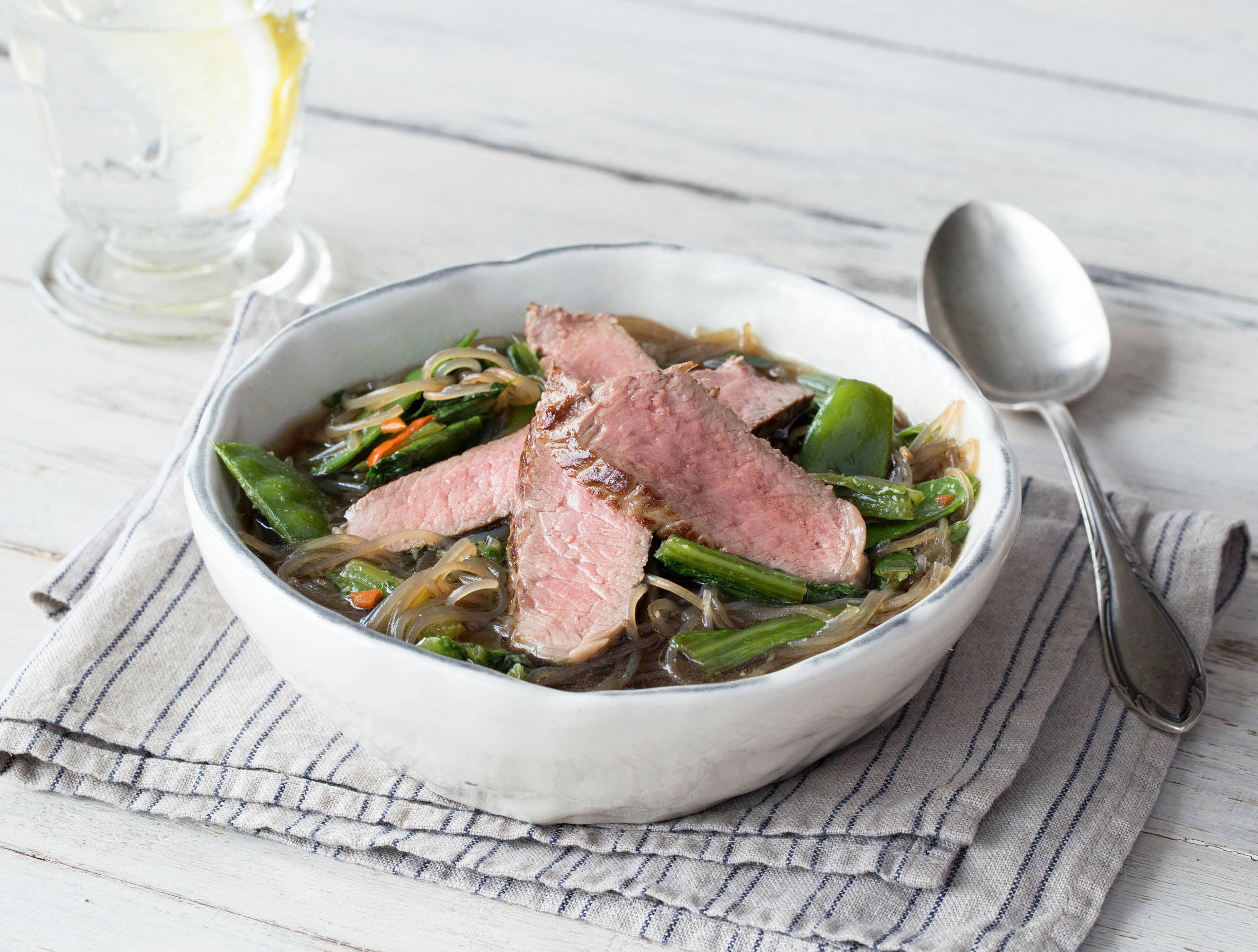servi avec des carottes multicolores, pommes de terre et mange-tout