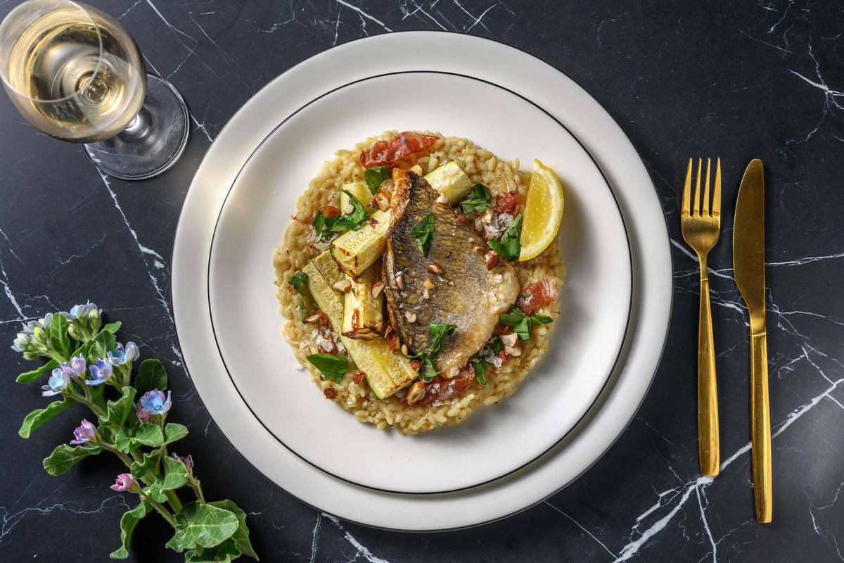 Servez le risotto avec le poisson et la courgette rôtie. Garnissez de la coppa di Parma, des quartiers de citron, du basilic et des noisettes. Saupoudrez le risotto du reste de parmigiano reggiano.