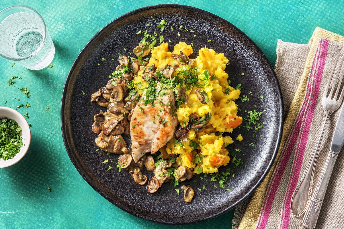 Le filet de poulet contient peu de graisse et beaucoup de protéines, il est donc plus léger que, par exemple, la cuisse de poulet. En accompagnement vous allez préparer une purée pas comme les autres : l'ajout de courge et tomate en fait une purée bien crémeuse et légèrement sucrée. Une association parfaite avec le goût boisé de la sauce aux champignons.