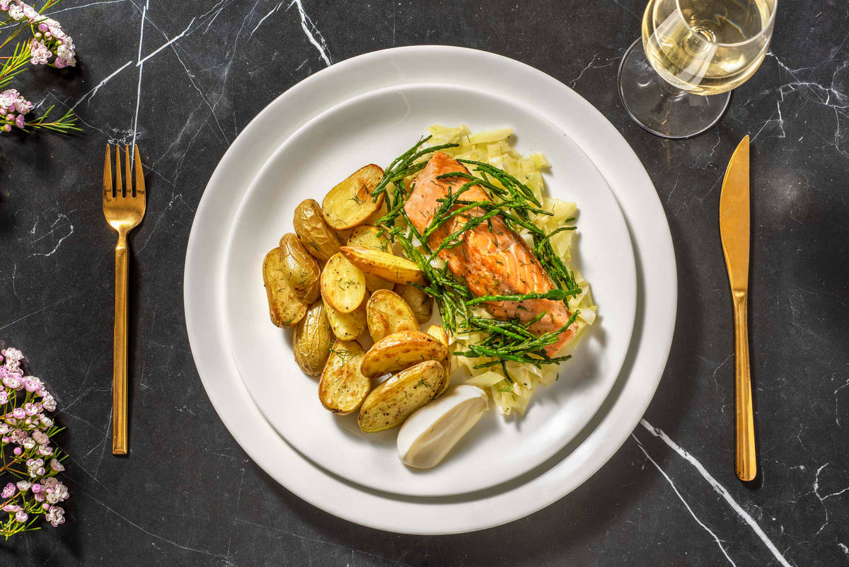 Disposez les grenailles sur les assiettes, servez le fenouil à côté et placez le filet de saumon dessus. Disposez la salicorne sur le saumon et garnissez le plat avec l’aneth. Accompagnez le tout de la mayonnaise au citron.