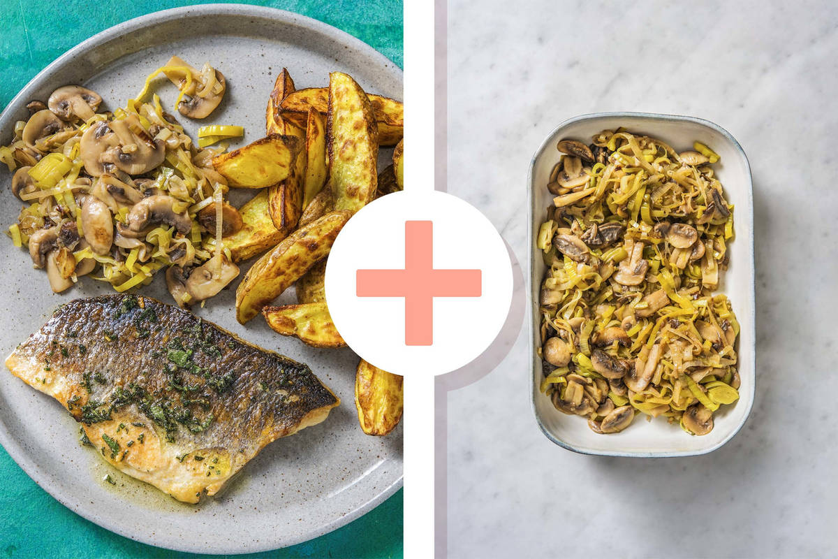 Verhit 1 el olijfolie per persoon in een koekenpan op middelhoog vuur en fruit de sjalot en 1 el knoflook per persoon 1 – 2 minuten. Voeg de prei, champignons en witte balsamicoazijn toe en bak de groenten in 5 –7 minuten zacht. Breng op smaak met peper en zout.