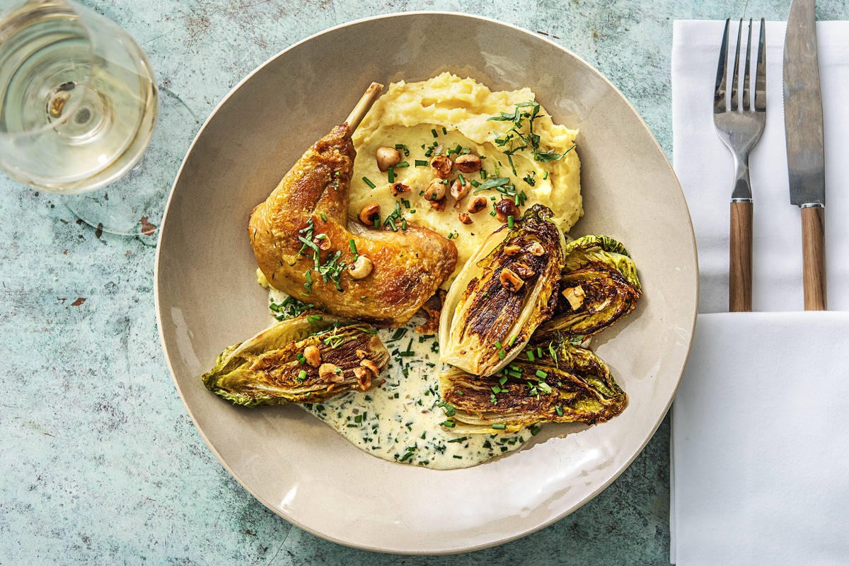 Verhit dezelfde koekenpan als gebruikt voor de hazelnoten op middelmatig vuur. Voeg de gekonfijte parelhoen toe en bak in 2 minuten per kant goudbruin. Leg op een bakplaat met bakpapier en bak 10 minuten in de oven, of totdat hij bruin en krokant is. Zet de koekenpan met 1 el bakvet per persoon opzij voor later gebruik. De rest van het bakvet heb je niet nodig.