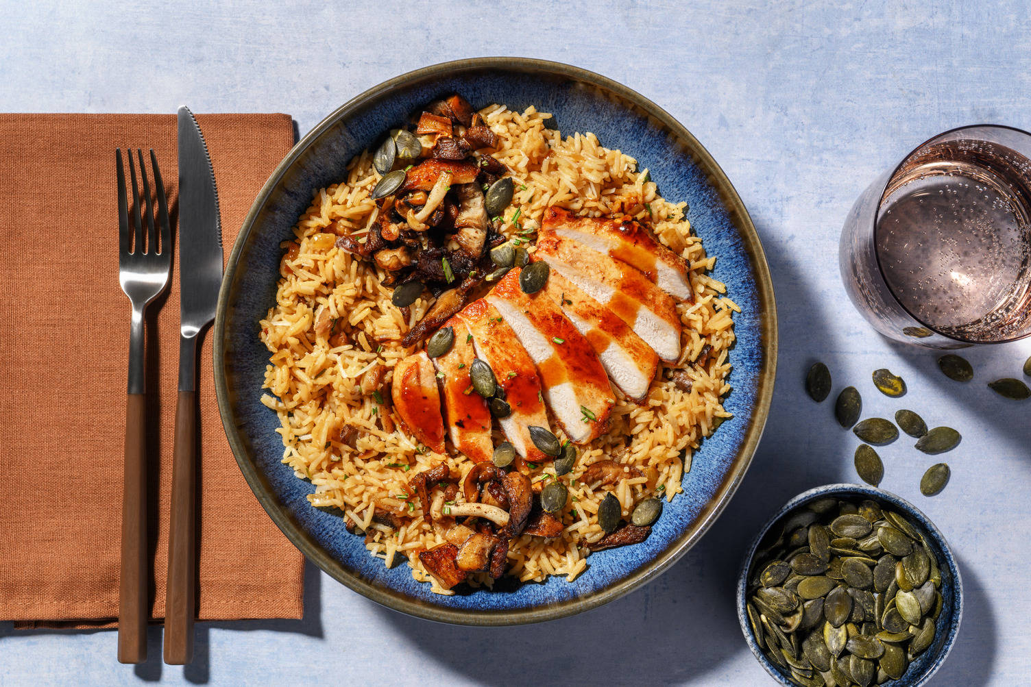 Verdeel de varkenshaas met de marinade over de borden. Serveer met de zoete aardappel en de furikakemayonaise ernaast. Garneer de zoete aardappel en varkenshaas met het groene gedeelte van de bosui. Verdeel de ponzu paddenstoelen over de borden. Serveer met de komkommersalade op tafel.
