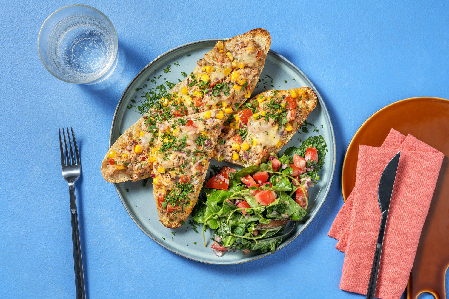 Snijd voor ieder een stuk van het gevulde bladerdeeg af en serveer met de tomatensalade.