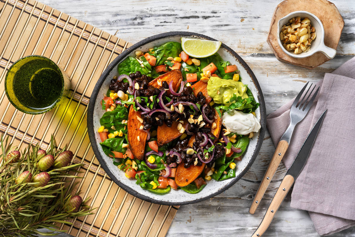 Verdeel de salade over de borden. Leg de zoete aardappel erbovenop en besprenkel naar smaak met extra vierge olijfolie. Beleg de zoete aardappel met het zwarte-bonenmengsel, de rode ui, de overige mais en tomatenblokjes. Serveer met de avocadodip en de limoensaus. Garneer het gerecht met de amandelen, bladpeterselie en 1 limoenpartje per persoon.