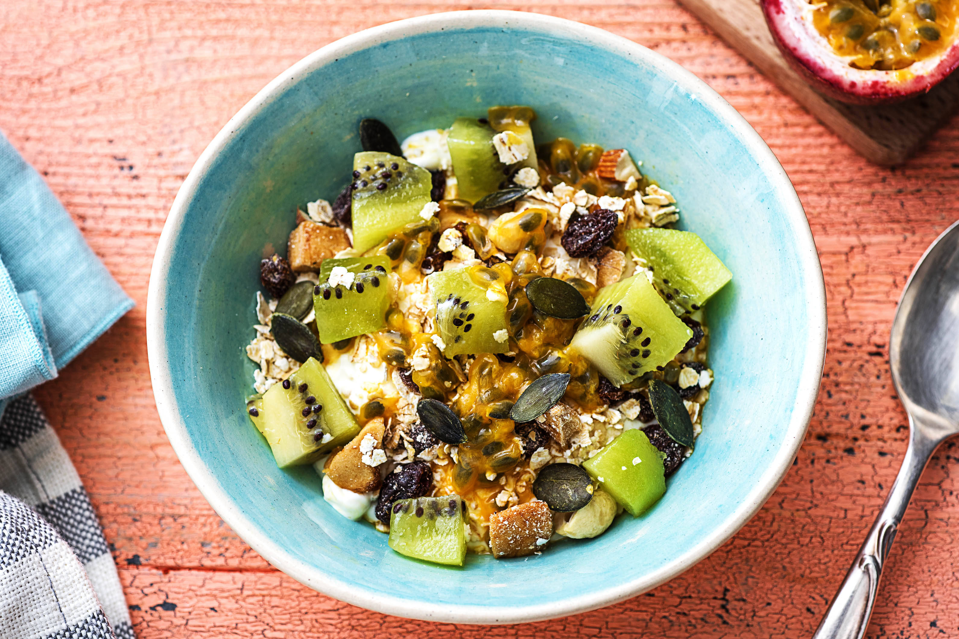 Verdeel het fruit over de ontbijtkommen en garneer met de cranberry-pittenmix.