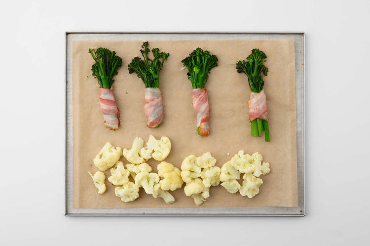 met broccolini in ontbijtspek en geroosterde bloemkool