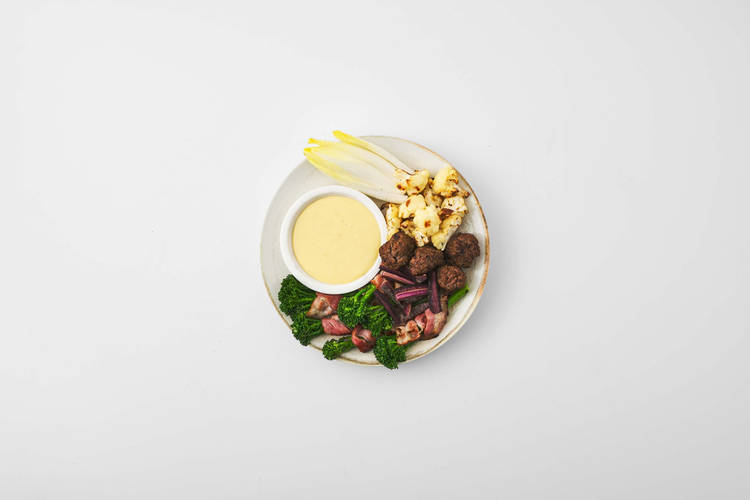 OF TWEEDE OPTIE: Kaasfondue met hertgehaktballetjes, broccolini en crudité