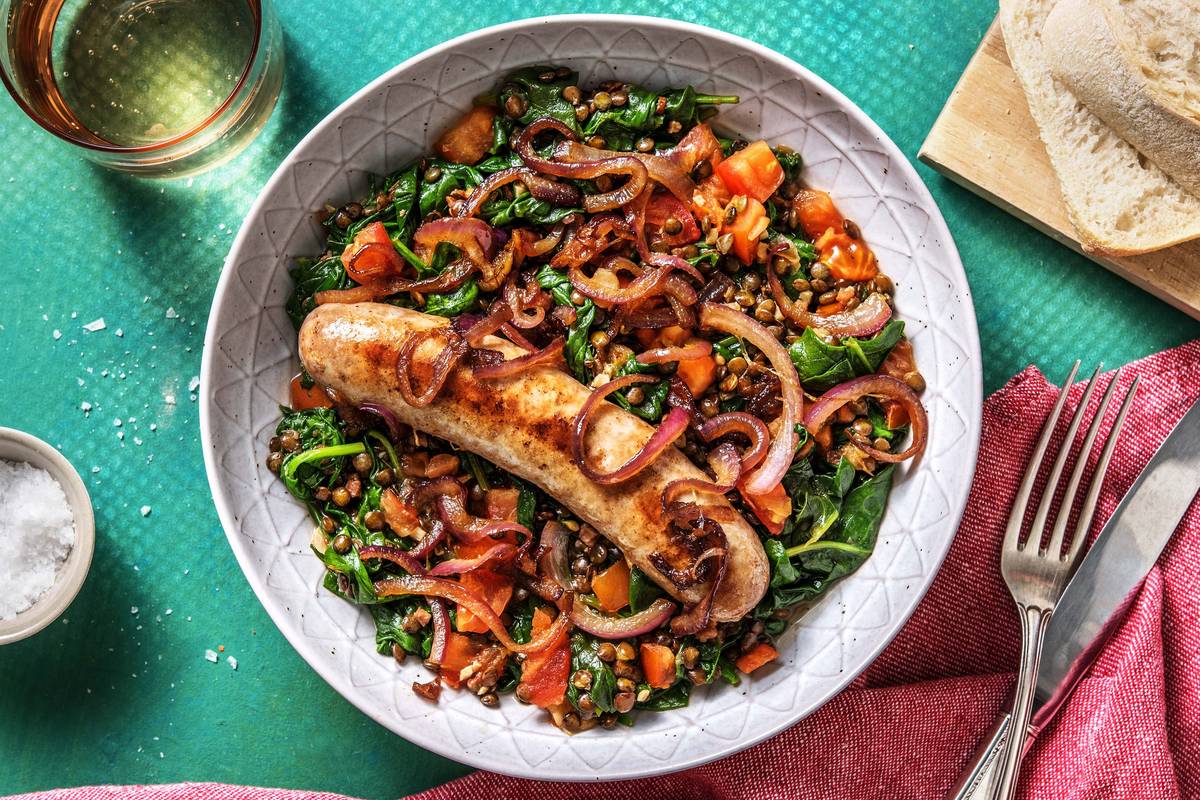 Roer het bakvet van de worst door de linzen met spinazie. Verdeel de linzen en spinazie over de borden, schep de worst erbij en garneer met de rode ui. Serveer met de witte ciabatta.