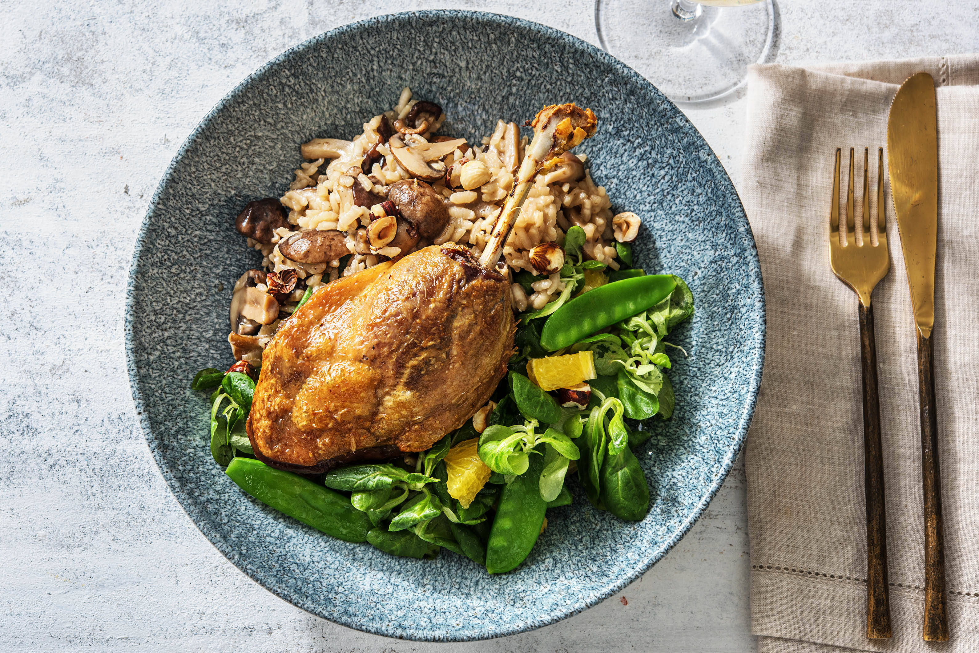 € 32.45 / kg<p><p>INGRÉDIENTS : 96 % canard, ail, romarin, thym, sel. CONSERVATION ET PRÉPARATION : À conserver au frais (max. 4 ⁰C). Disposez la cuisse de canard confite sur une plaque de cuisson recouverte de papier sulfurisé ou dans un plat à four. Faites-la cuire 20 à 22 minutes dans un four chauffé à 200 degrés. ORIGINE : Pays de naissance : Pays-Bas; Pays d'élevage : Pays-Bas; Pays d'abattage : Pays-Bas. HelloFresh Antwoordnummer 39162 1090 WC Amsterdam Pays-Bas <small>HelloFresh met tout en œuvre pour communiquer les informations les plus exactes possibles sur ses produits mais ne peut cependant garantir l'exactitude, le caractère complet et/ou actuel de ces informations. Nos recettes sont régulièrement revues et améliorées, ce qui signifie que les informations concernant les allergènes (telle que la mention ""peut contenir de""), la valeur nutritionnelle, les ingrédients ou tout autre détails sur nos produits peuvent être amenées à changer et que des différences peuvent apparaître entre les informations indiquées sur le Site Internet et/ou l'Application et celles présentes sur le produit. En cas de doute, toujours se référer aux informations présentent sur l'étiquette. Pour toute question sur nos produits, merci de contacter le service clients. Si vous avez des questions sur des produits qui ne sont pas vendus sous la marque HelloFresh vous pouvez également contacter directement le fabricant des ces produits si vous le souhaitez.</small>