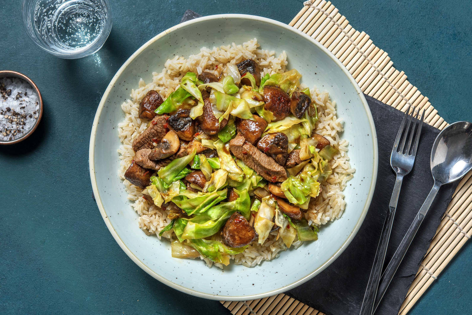 met spitskool, champignons en rijst