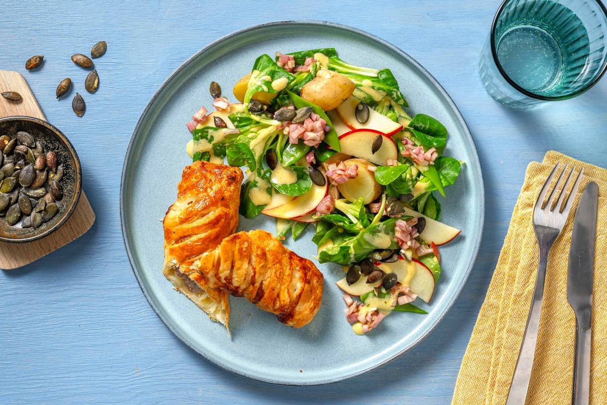 Enroulez la pâte feuilletée autour de la garniture en partant du côté non humecté. Refermez le tout avec le bord humecté et repliez les extrémités. Disposez les pains saucisses sur la plaque de cuisson recouverte de papier sulfurisé, fermeture vers le bas. Entaillez la pâte feuilletée en croisillons et assaisonnez de poivre. Enfournez les pains 25 à 30 minutes, ou jusqu’à ce que la pâte soit dorée.
