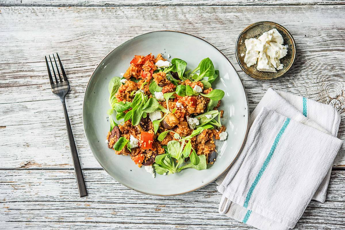 Voeg de gebakken aubergine toe aan de couscous en breng eventueel verder op smaak met harissa, peper en zout.