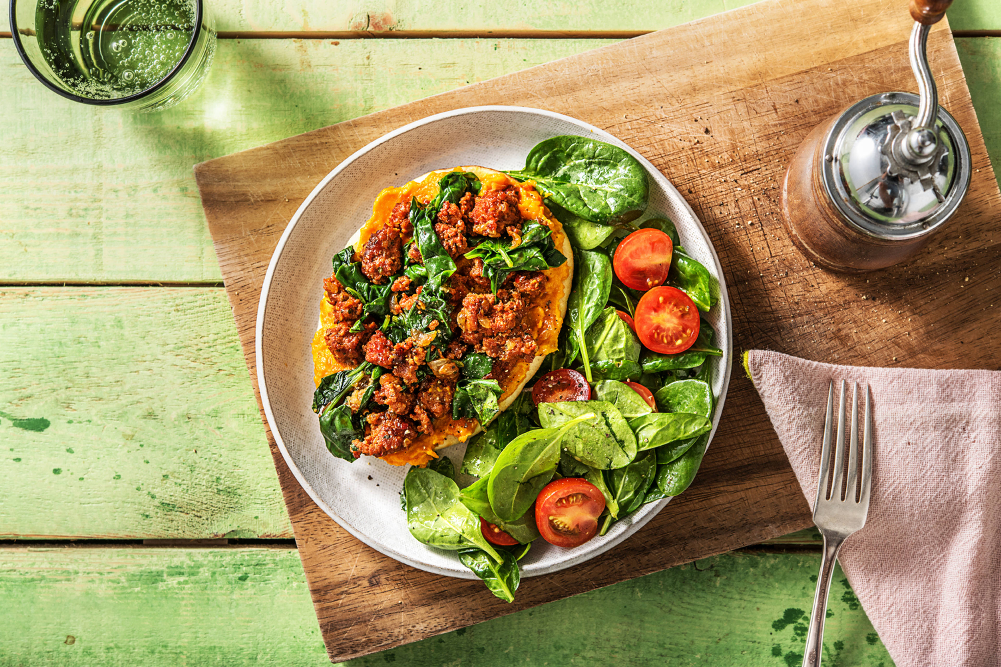 • Dispersez-y le maïs, les tranches de steak et l'œuf mollet.