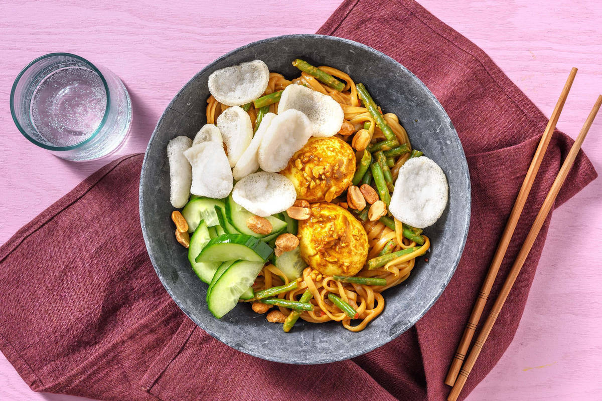 Servez les nouilles aux haricots sur les assiettes. Garnissez-les avec le reste de cacahuètes caramélisées et accompagnez-les des œufs au curry, de la salade de concombre et des chips de crevettes.