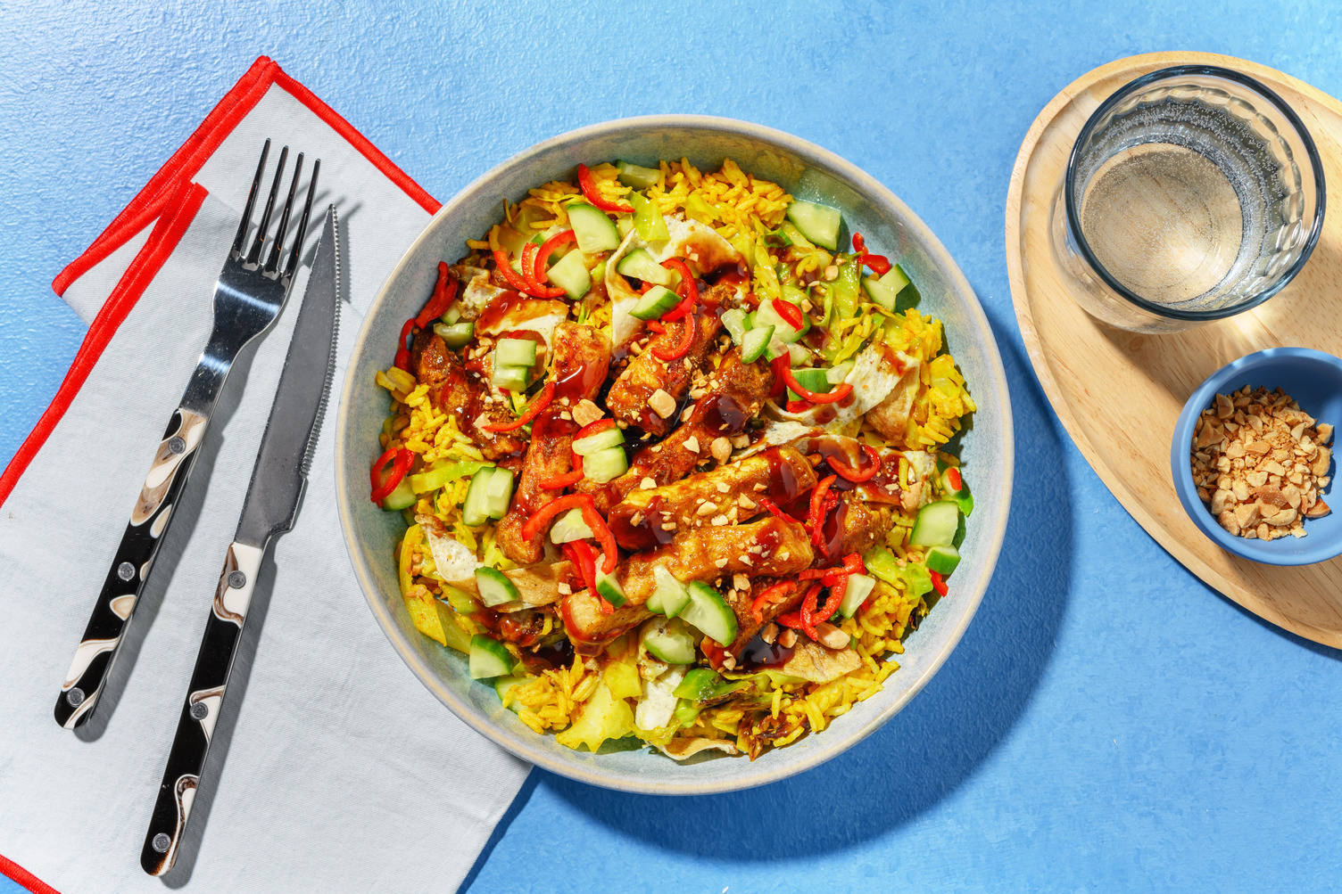 Disposez la salade sur les assiettes. Servez-la avec les aiguillettes de poulet.