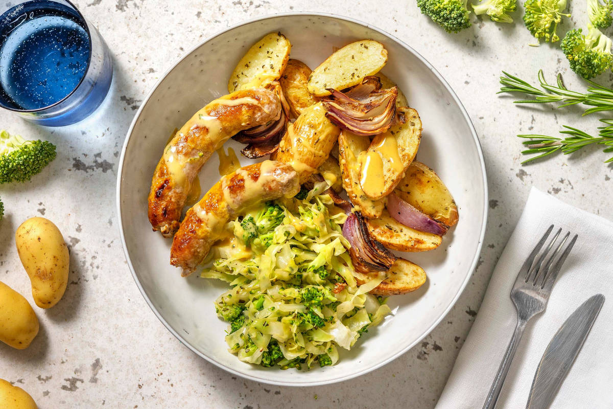 Servez les grenailles et les légumes dans des assiettes creuses. Disposez les saucisses de porc dans les assiettes. Versez le reste de marinade miel-moutarde par-dessus.