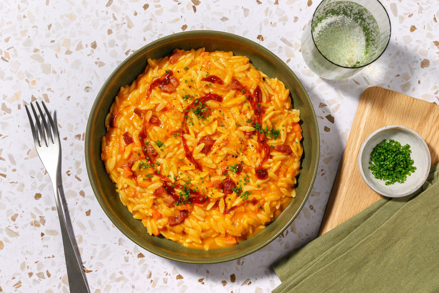 Dep tegen het einde van de oventijd de schelvisfilet droog met keukenpapier. Smelt de roomboter in een koekenpan en bak de schelvisfilet 2 – 3 minuten per kant op middelhoog vuur. Haal de vis uit de koekenpan en roer de bieslooksaus door het bakvet in de pan.