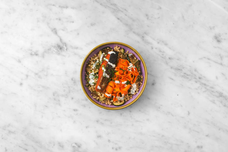 • Serveer de parelcouscous op diepe borden en leg de wortellinten en de zalm erbovenop.