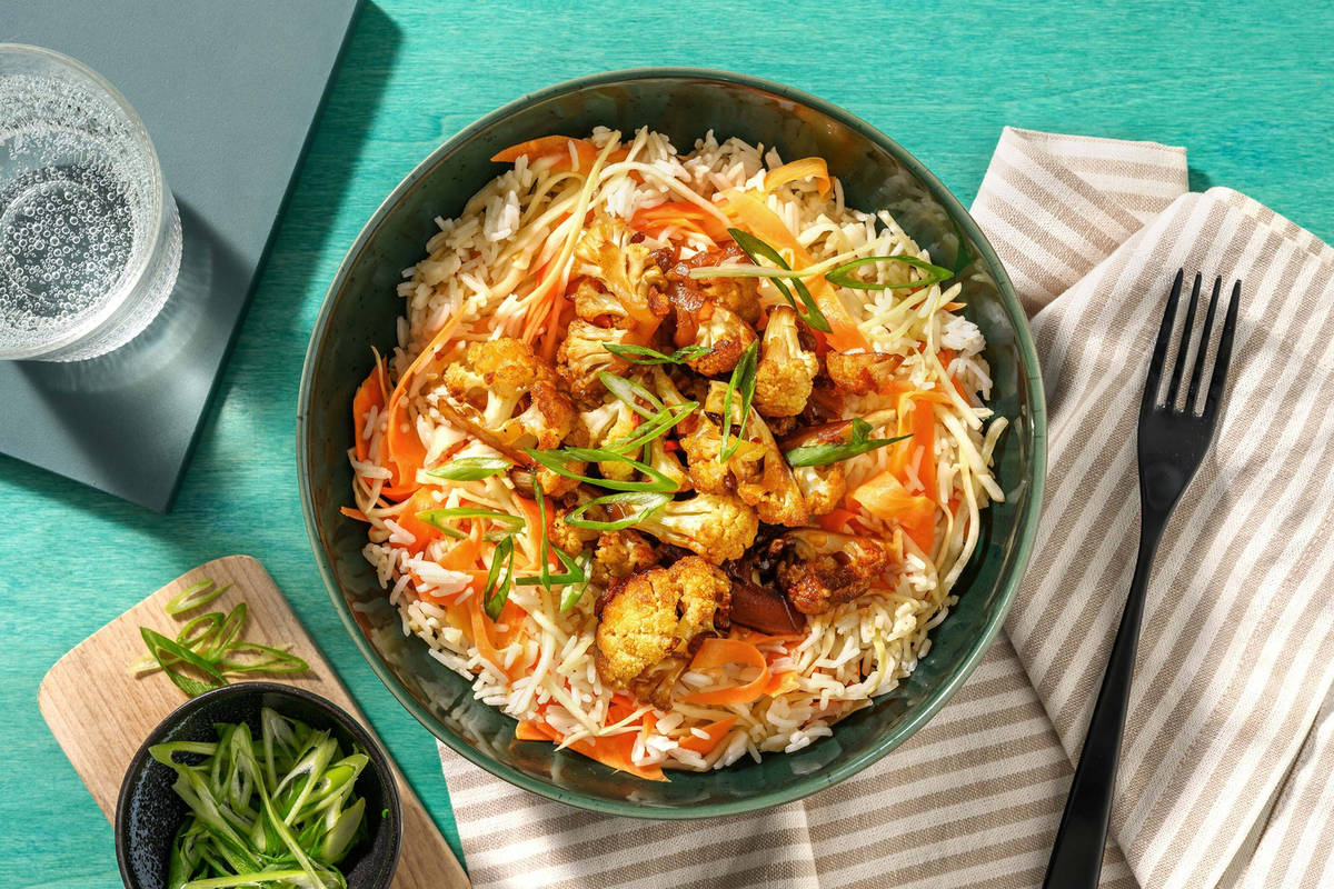 - Verdeel de sticky bloemkoolroosjes met saus over de rijst.