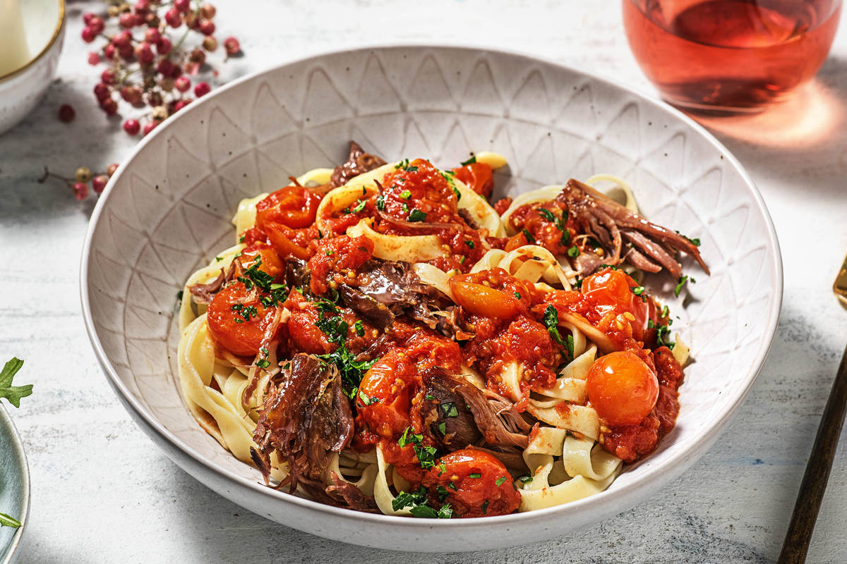 Le ragù est une sauce italienne à base de viande ou de volaille qui mijote longtemps pour que les saveurs pénètrent bien. Dans cette recette, vous allez utiliser du canard confit, ajouté au dernier moment. Confit — c’est-à-dire cuit lentement dans sa graisse —, le canard est extrêmement savoureux. Et le goût sucré du vinaigre balsamique apporte de la profondeur à la sauce.