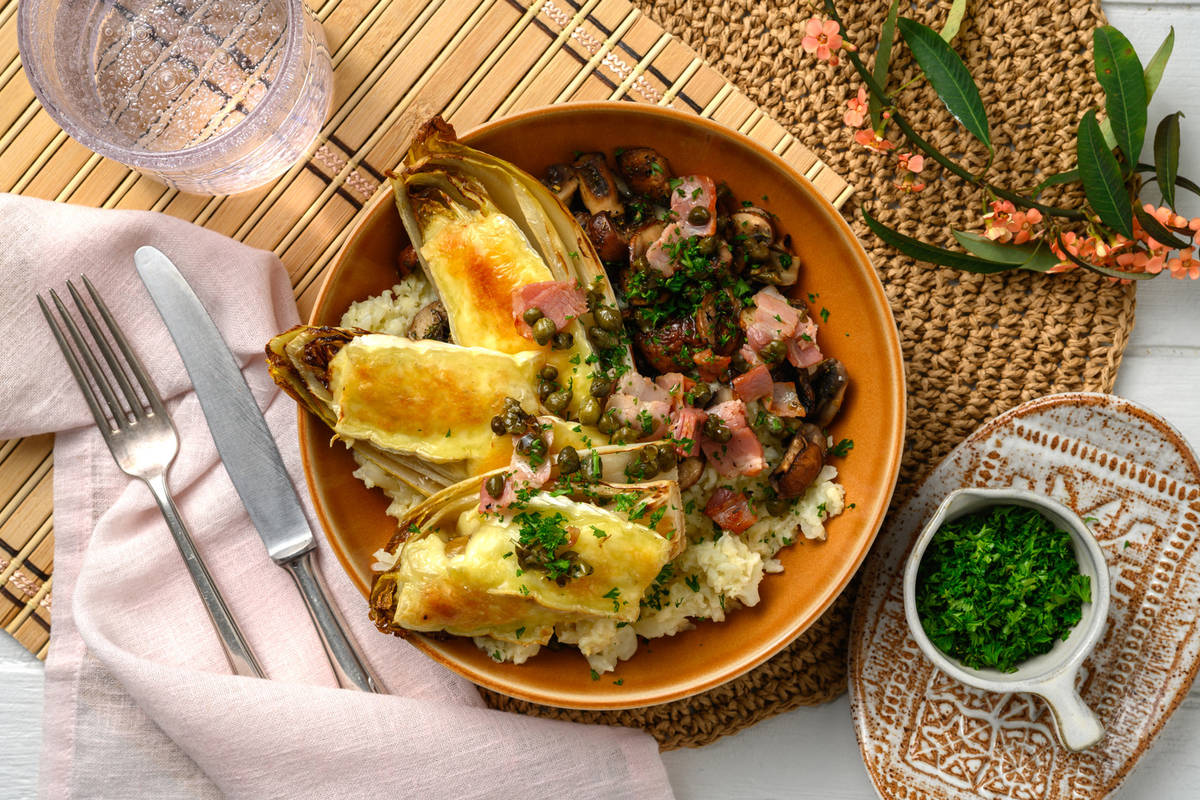 Verdeel de bloemkoolrijst over de borden en leg de gebakken witlof met brie erbovenop. leg de champignons eromheen. Garneer met de hazelnoten, de kappertjes, de spekstukjes en de krulpeterselie.