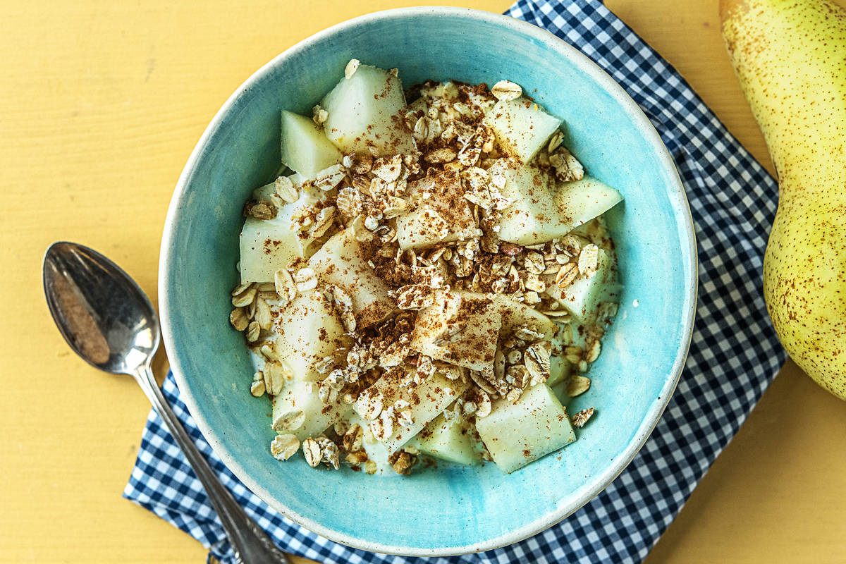 Disposez la moitié des poires dans les bols, ajoutez le yaourt bulgare, puis le reste de poire.