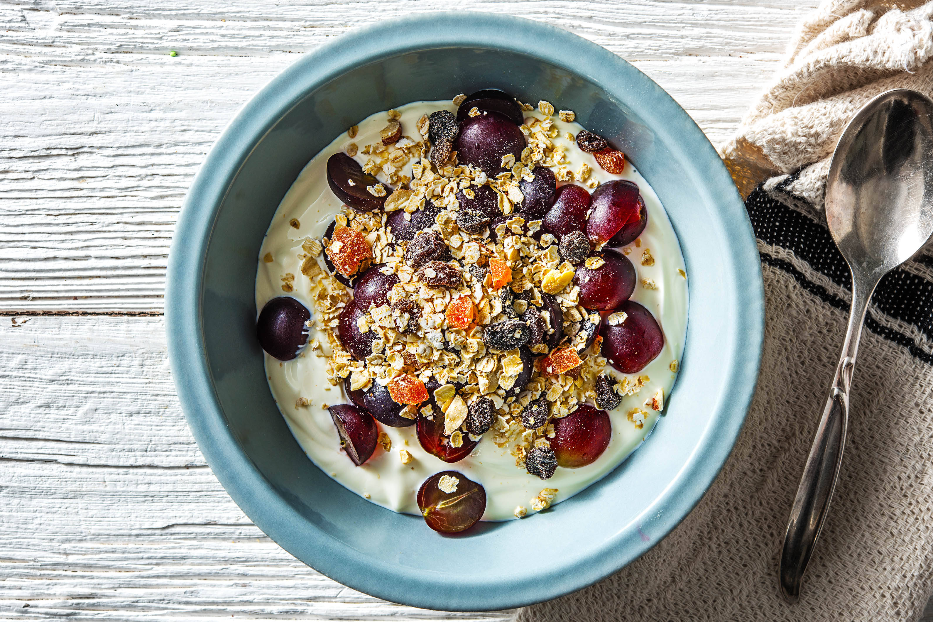 Meng de Griekse yoghurt met de halfvolle yoghurt in de ontbijtkommen.